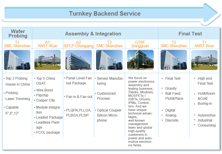 Assembly & Test Business Group is one of important semiconductor platforms elaborately created by CR Micro. It covers the whole industrial chain such as semiconductor wafer test, traditional IC packaging, power device packaging, high-power module packaging, advanced panel packaging, silicon microphone or optocoupler sensor packaging and finished products test. After years' development and layout, it has established large-scale production base in Wuxi, Shenzhen, Dongguan and Chongqing. With perfect quality system, the products have been widely applied in the fields such as black-and-white home appliances, communication, industrial control and automobile and win the recognition and praises from domestic and overseas important semiconductor companies.